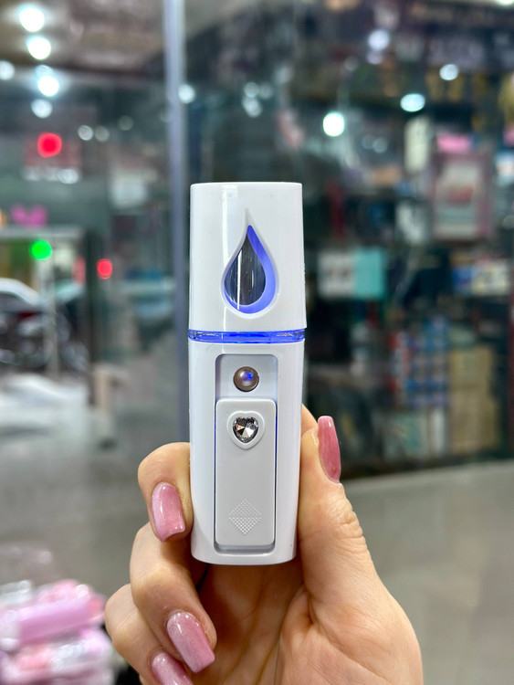 مرطوب کننده پوست دارای آینه دارای نور هایلایت دارای کابل شارژ USB کوچک و قابل حمل دارای ظرفیت مخزن آب 20 میلی لیتر دارای باتری داخلی 450 میلی آمپری توان مصرفی 3.15 وات