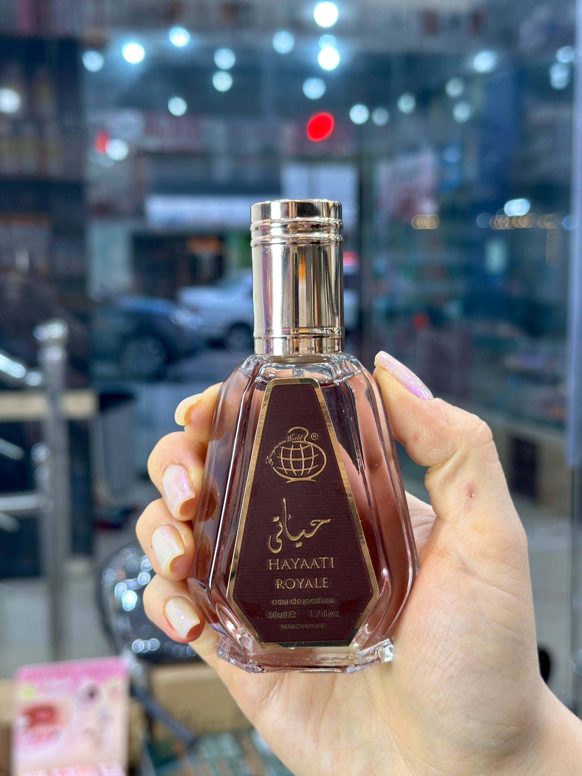 ادکلن 50 میل فراگرنس ورد مدل حیاتی رویال (Fragrance World Hayaati Royale)، یک ادو پرفیوم باکیفیت و جذاب از برند معتبر فراگرنس ورد است که رایحهای مشابه عطر پرفروش عربی ارض الزعفران موصوف (Mousuf) دارد.